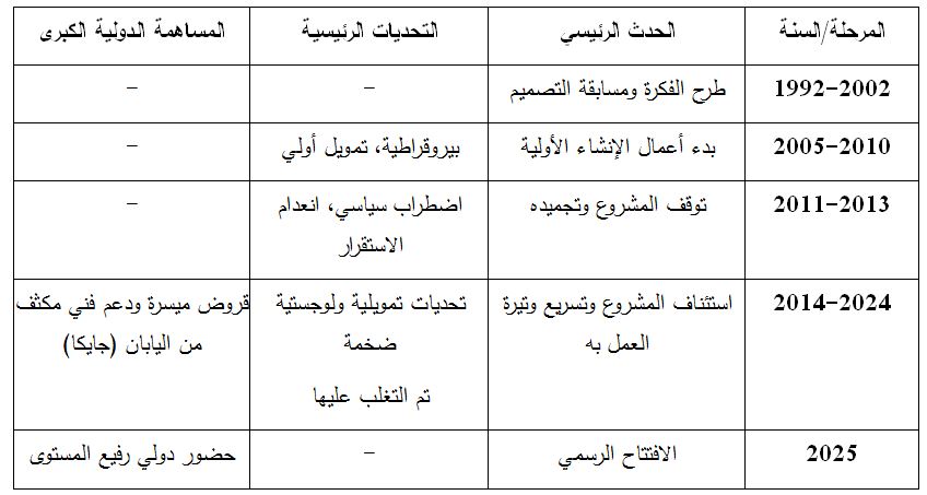 إن إنجاز المشروع رغم العقبات البيروقراطية، وتحديات التمويل، والاضطرابات الإقليمية، يُقدم "كدرس في الإرادة والإدارة والإيمان بالمستقبل". إنه رمز للصمود المصري ولقدرة الدولة المصرية الحديثة على تحويل التحديات إلى إنجازات، وهو ما يتضح في الجدول التالي: